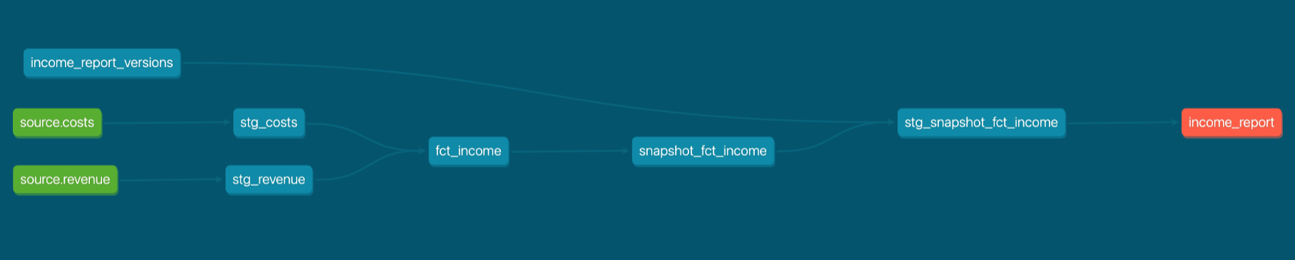 to join in the seed file to determine which versions are “correct”. Her new DAG looks like this, where int_income_history